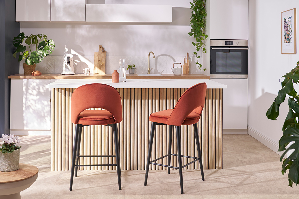 Le tabouret de bar BELLEROSE est une pièce intemporelle. Sa silhouette élancée épouse avec élégance le velours (100% polyester) à la douceur incomparable. Détail de style : l'élégant passepoil ton sur ton qui sculpte le tissu apporte un joli look couture.
