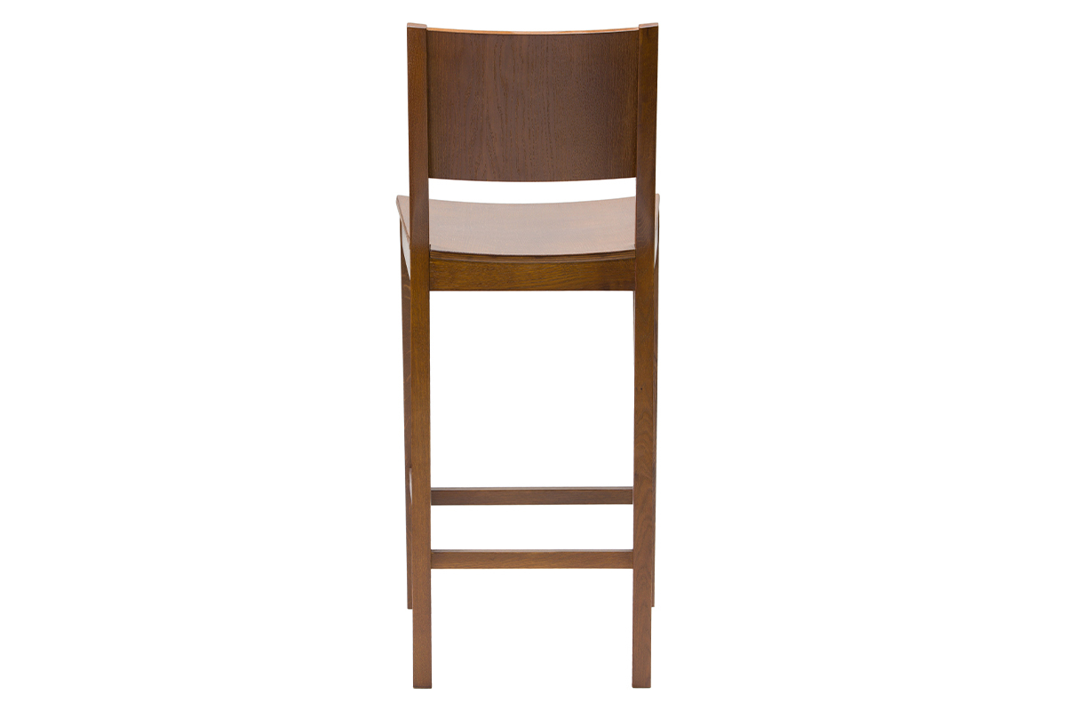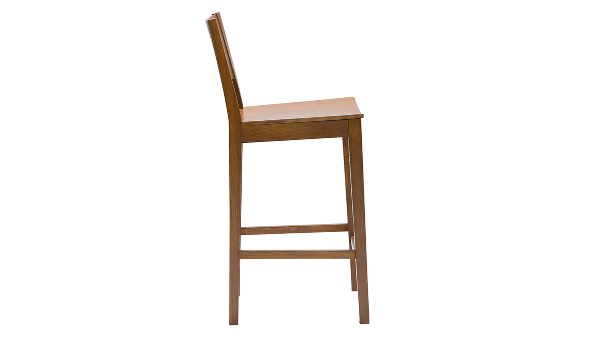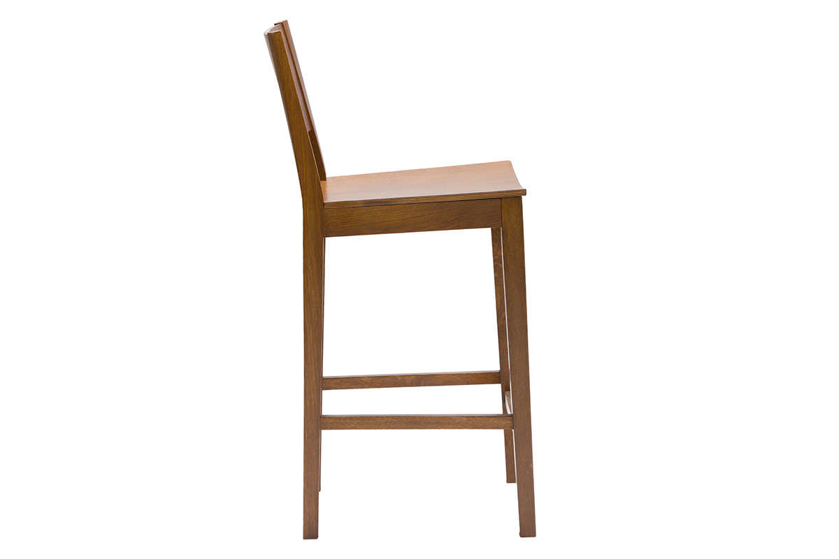 Ce tabouret de bar en bois fabriqué en Europe a une hauteur d'assise de 65 cm. En plus d'être robuste, cette chaise de bar bois foncé offre une assise agréable grâce à un dossier haut et à un repose-pied justement positionné.