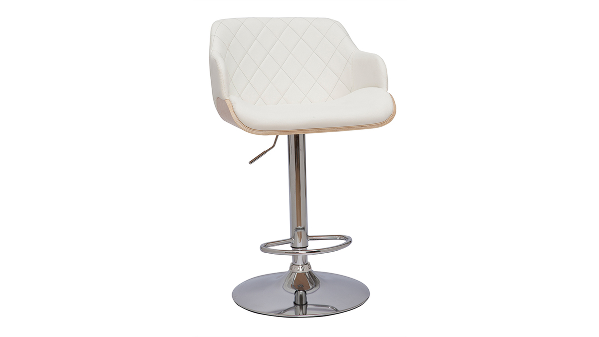 L'association du bois clair, du polyuréthane blanc et du pied en métal chromé fait de ce tabouret de bar réglable 360° d'inspiration rétro, un élément déco tendance. Grâce à son style club unique qui lui vaut toute son élégance, le modèle LUCIEN se fondra avec finesse à une ambiance contemporaine ou vintage chic.