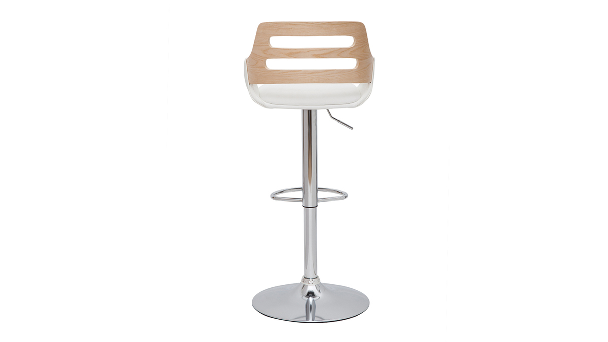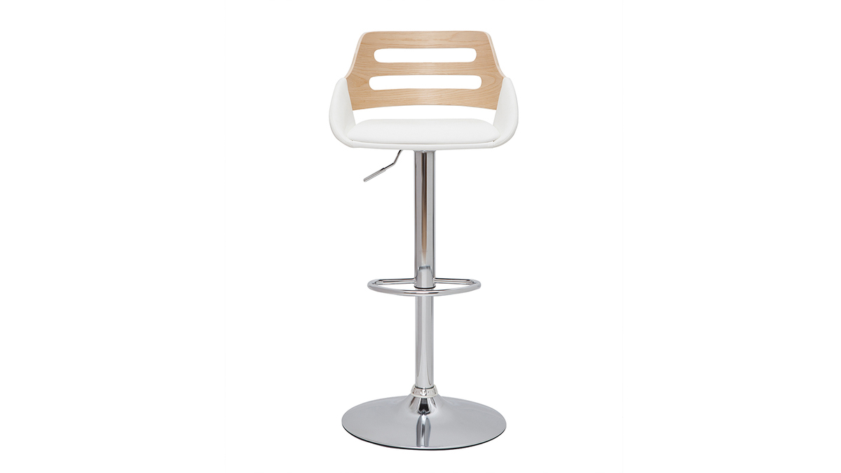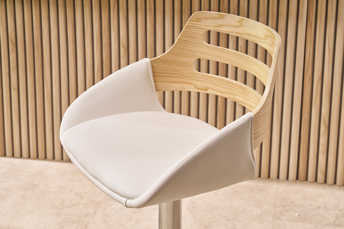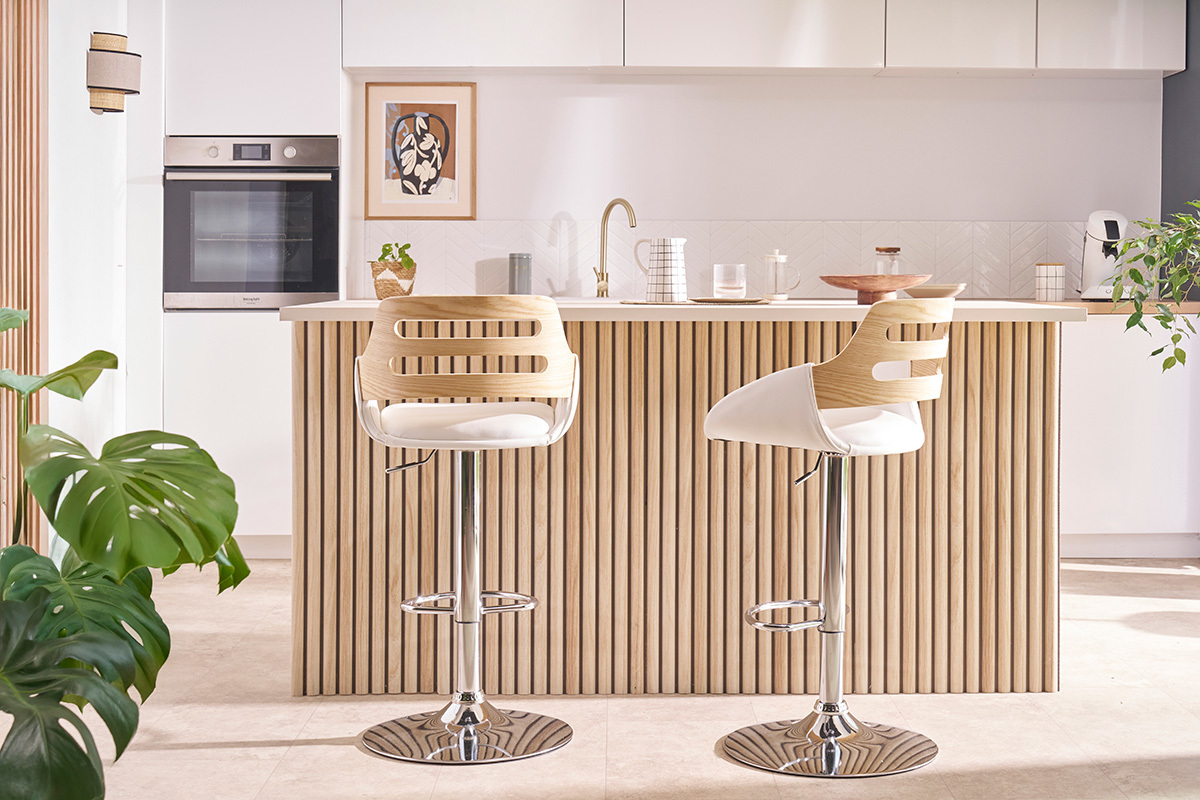 Le tabouret de bar relevable design PERNIK est un must-have des intérieurs contemporains. Il se distingue par son joli dossier en bois courbé aux lignes fluides et dynamiques. Le jeu de découpes dans le bois renforce son identité graphique. Le placage en chêne clair offre un rendu chaleureux avec son veinage contrasté et ses douces nuances dorées.
