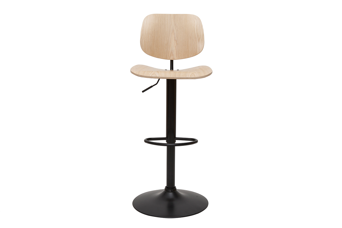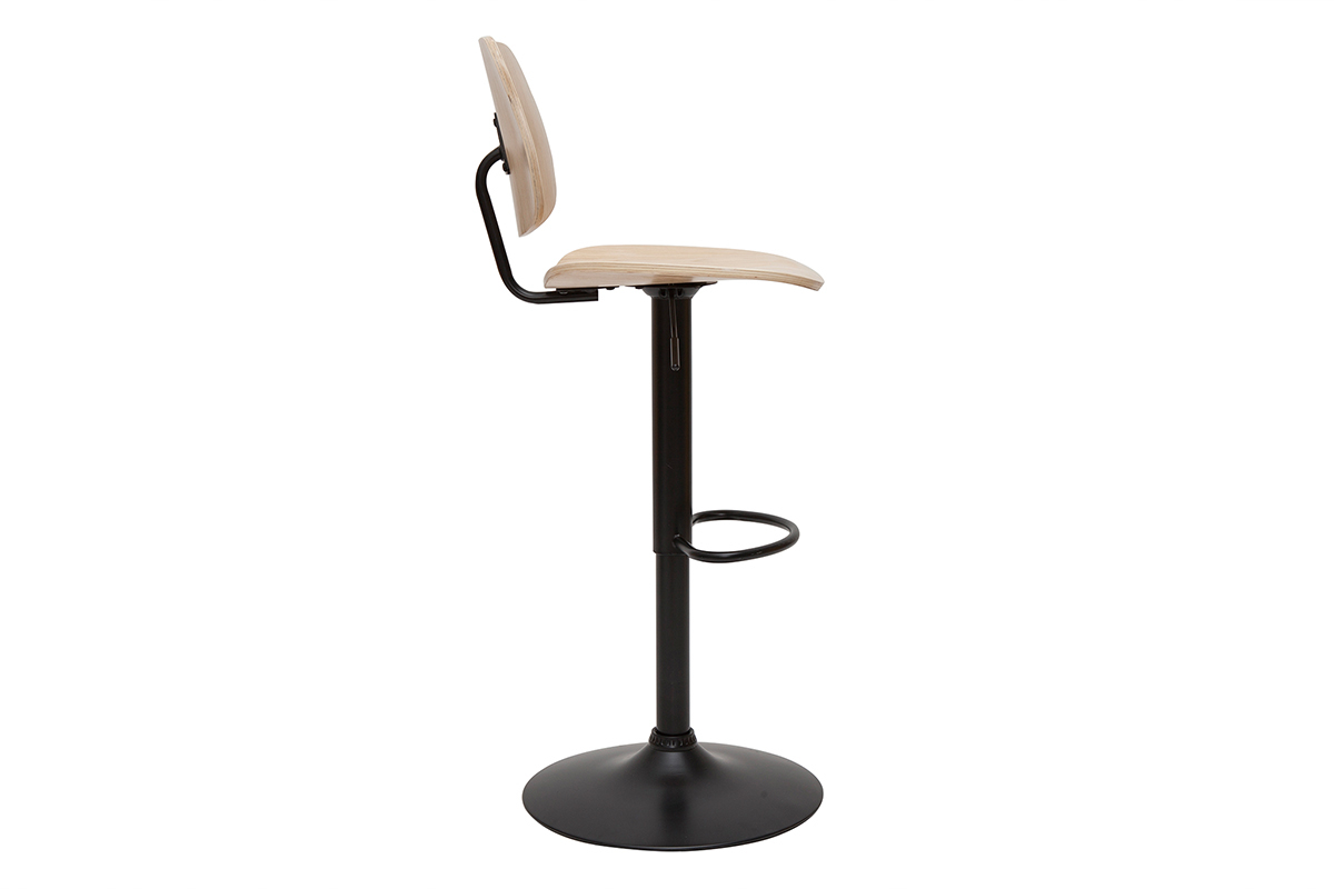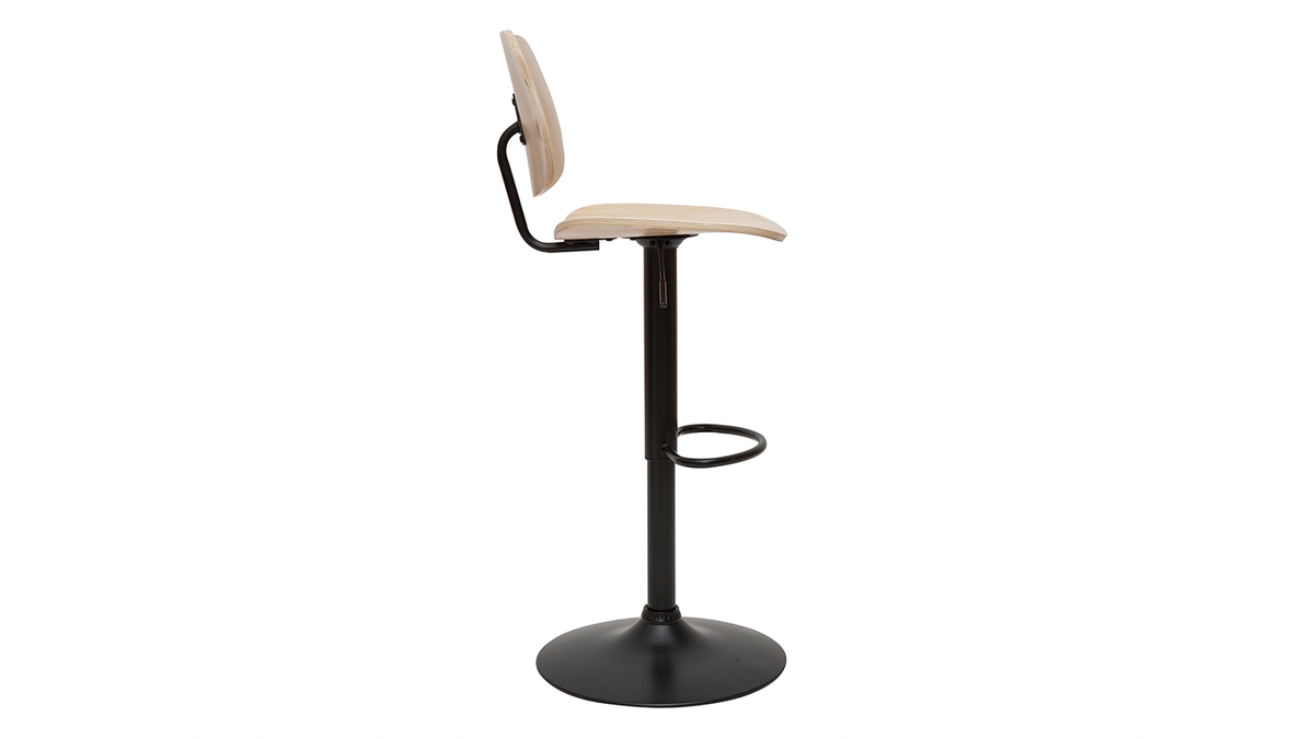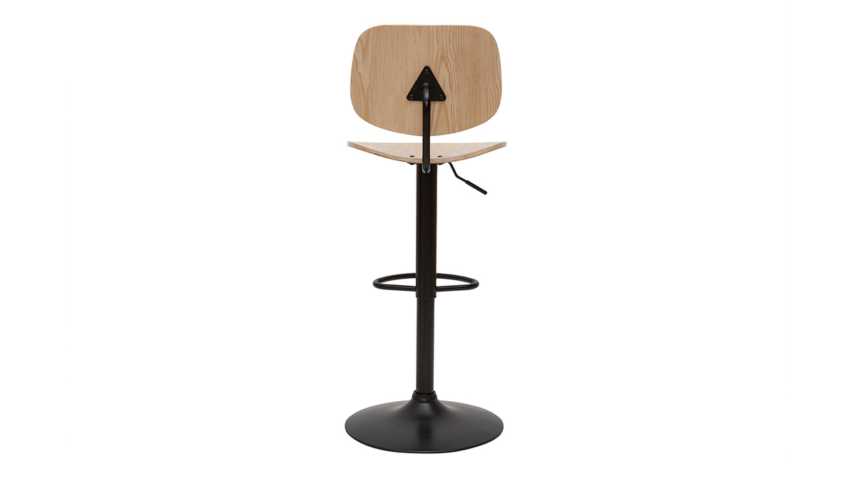 Avec son assise et son dossier bois clair aux angles arrondis, il évoque subtilement les pièces de mobiliers des 60's. Cultivant son propre style, il repose sur un piètement en métal noir qui contrebalance parfaitement l'effet rétro de son siège. Ce juste équlibre offre un tabouret de bar au look unique et ultra tendance !