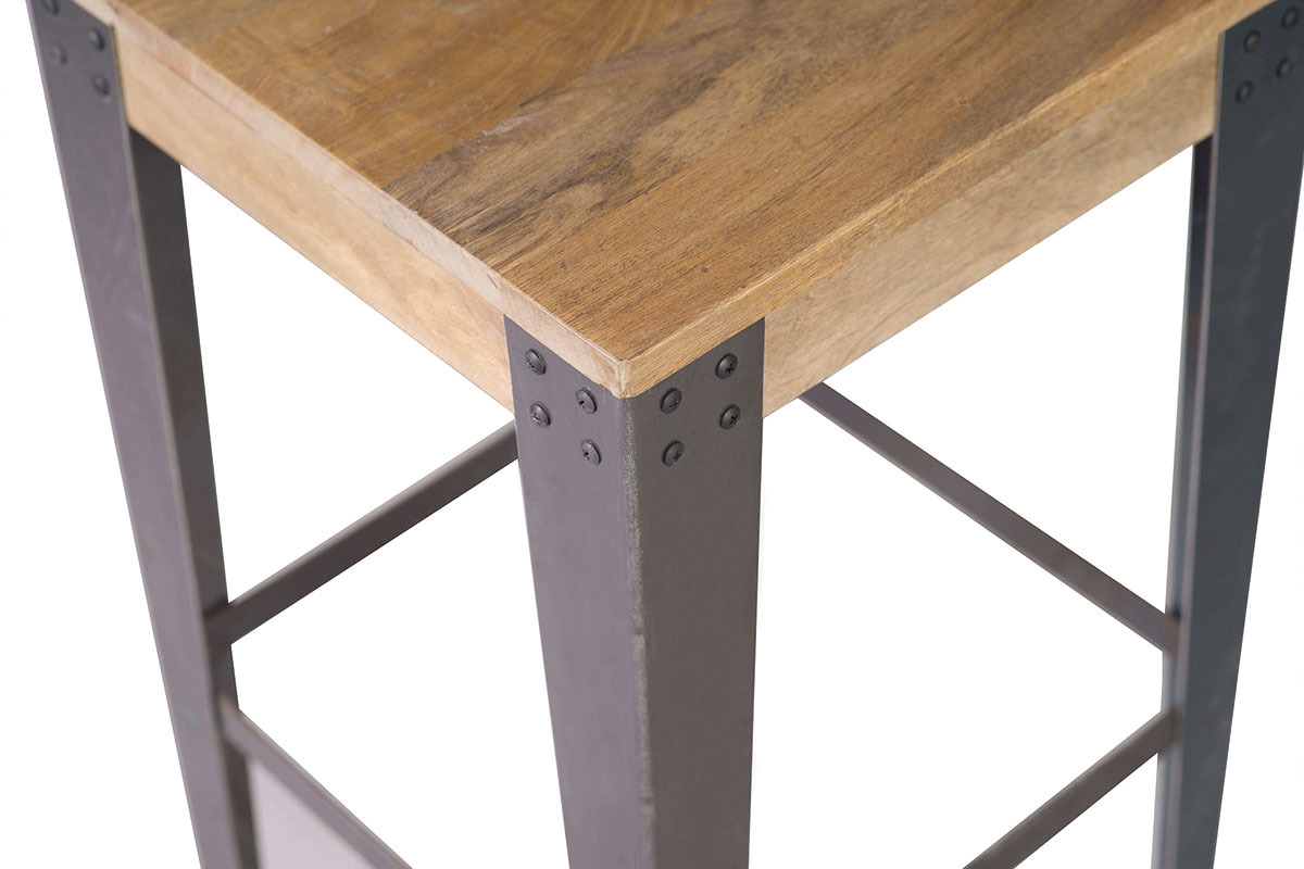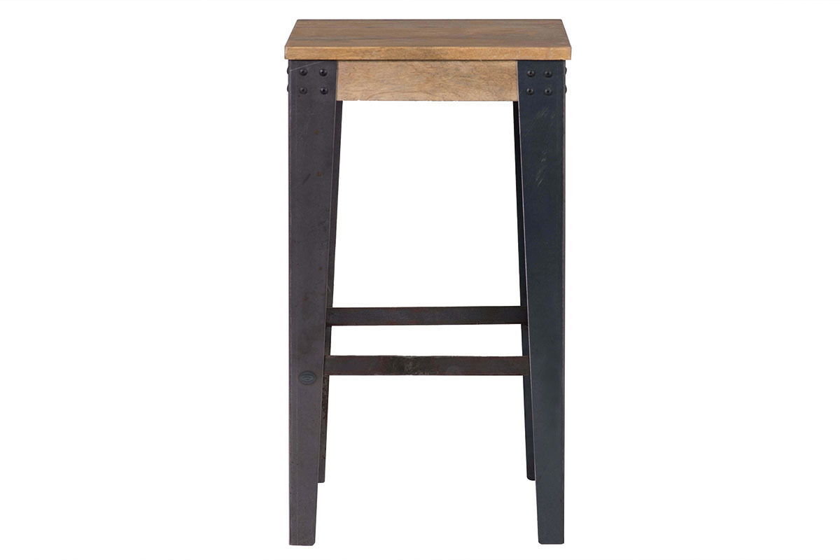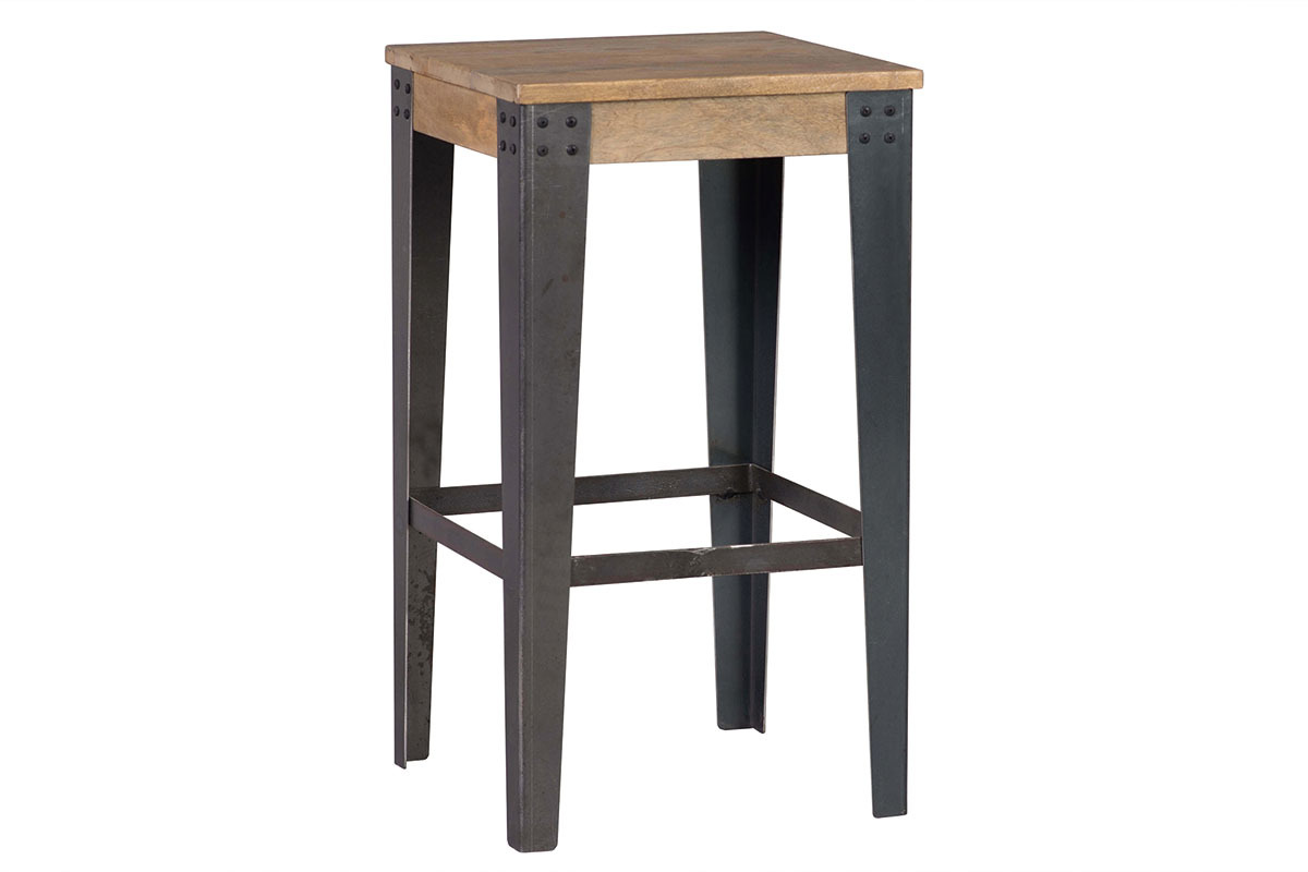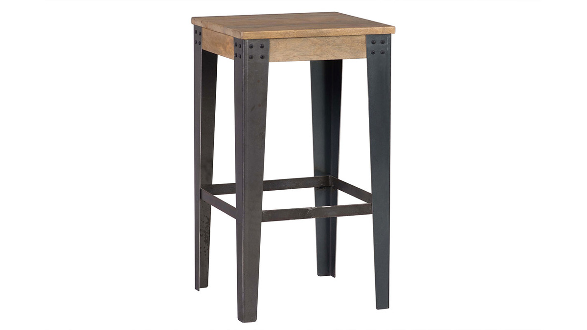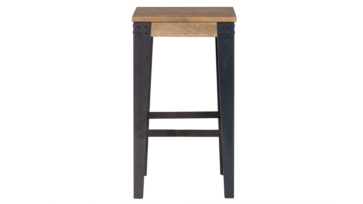 Les angles renforcés par des cornières rivetées soutiennent ce tabouret en manguier. Le manguier est nuancé de tons jaunes à marron pour un intérieur chaleureux et tendance. C'est également un bois très résistant qui saura durer dans le temps sans vieillir. Il est apprécié pour son aspect strié et se marie joliment avec les matériaux bruts tels que le métal.