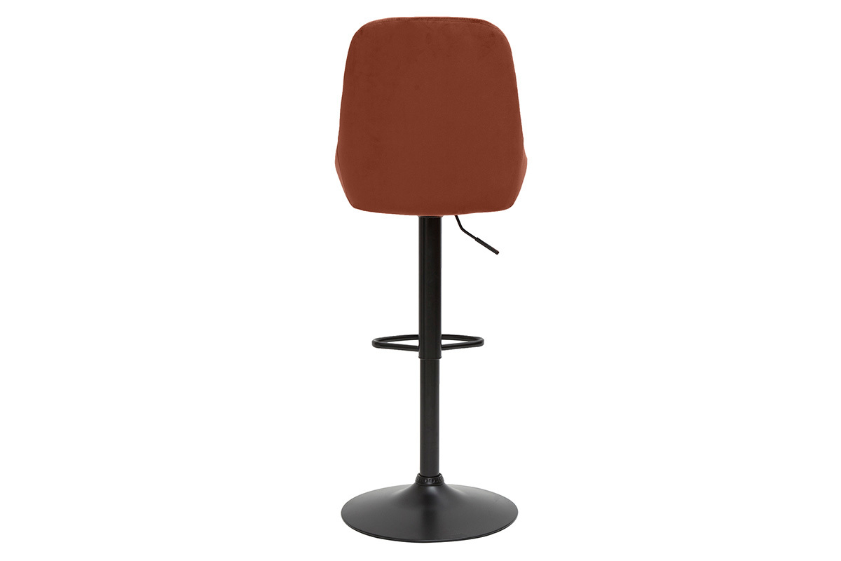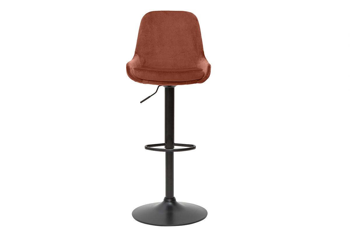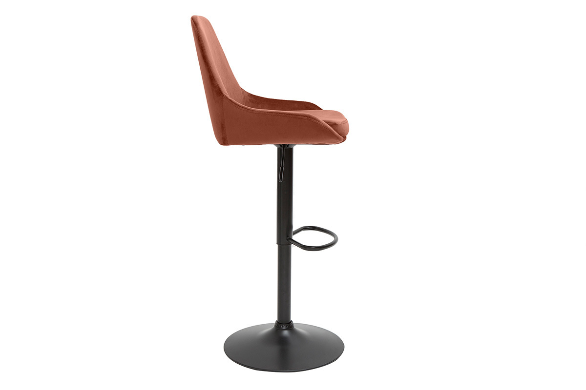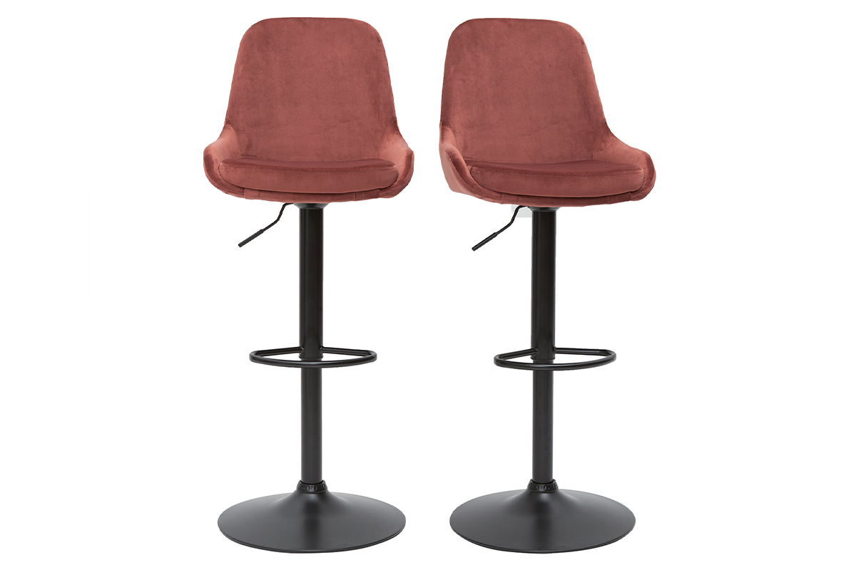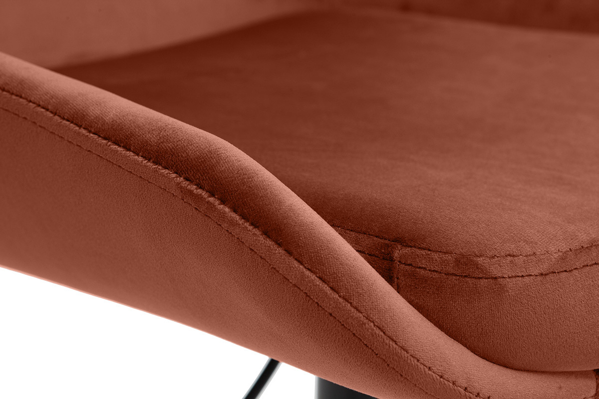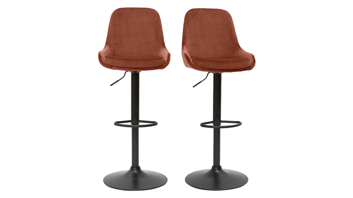 En plus d'être parfaitement fonctionnels, les tabourets de bar HOLO offrent un vrai confort d'assise grâce à leur coque enveloppante. L'assise et le dossier sont rembourrés (densité mousse 24 kg/m3) et entièrement recouverts d'un magnifique tissu velours rouge tomette (100% polyester) ultra doux au toucher. Le dossier haut (H38 cm) et le repose-pied intégré renforcent un peu plus l'idée de confort.