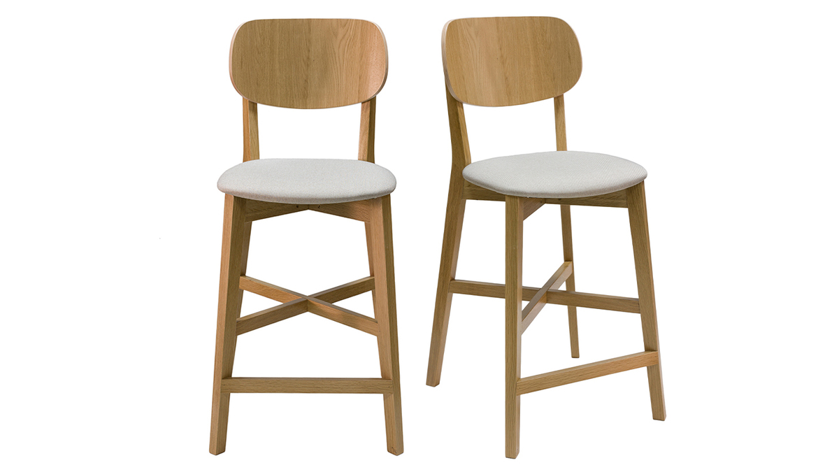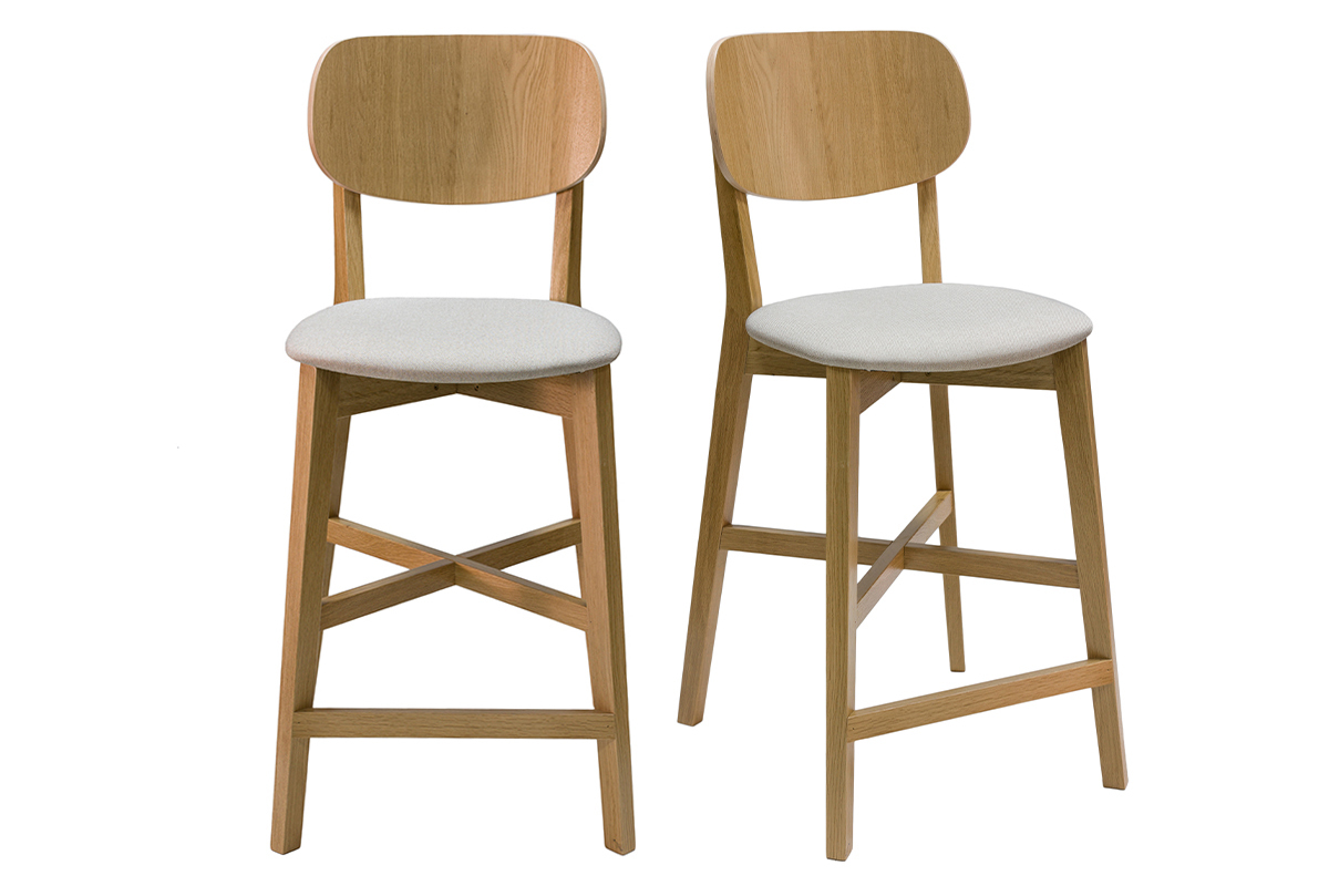 Ces tabourets de bar H65 cm sont munis d'une traverse de manière à garantir une stabilité parfaite. Le dossier haut et incurvé et l'assise rembourrée (densité de la mousse 35 kg/m3) offrent un confort durable. L'assise est recouverte d'un joli tissu beige, doux au toucher et très facile d'entretien (100% polyester).