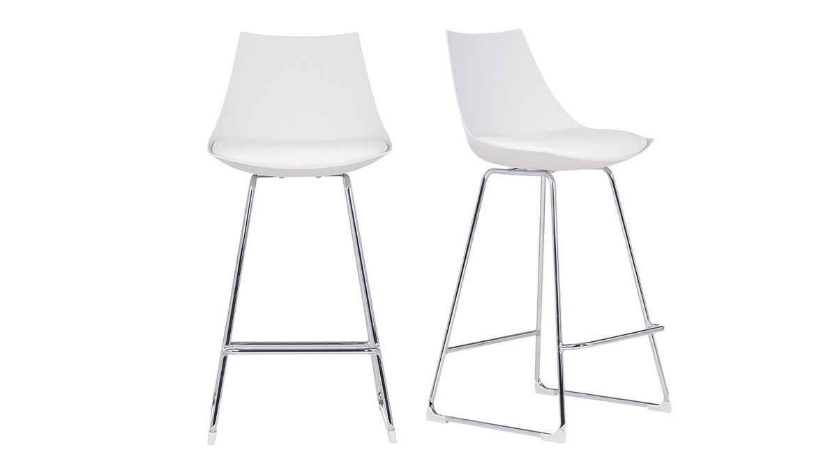 Les tabourets hauts JUNE sont discrets, design et pratiques avec leur assise en polypropylène blanche et leur piètement en métal chromé. Ces deux matières offrent un rendu design et raffiné et attestent de la solidité des tabourets. Pour le confort, ils sont dotés d'un haut dossier, d'une assise rembourrée (densité 24 kg/m3) ainsi qu'un repose-pieds. Parfait pour passer un repas ou faire une réunion bien installés !