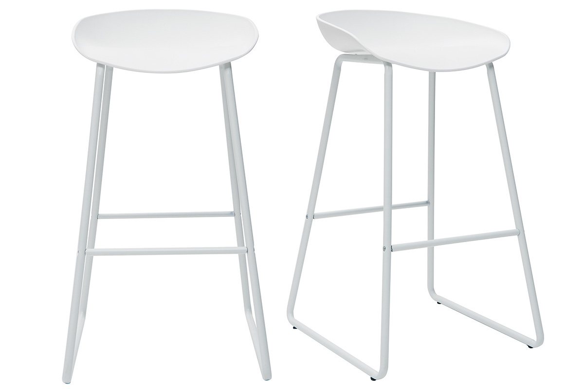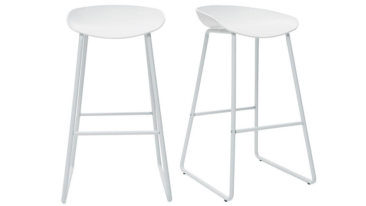 Travaillés dans un joli monochrome blanc, ces tabourets de bar sont idéaux pour intégrer discrètement une pièce à vivre ou compléter un îlot de cuisine. Le jeu de matières entre le piètement en métal et l'assise en polypropylène offre différentes nuances de blanc pour un rendu élégant et moderne. Leur forme minimaliste présente quelques singularités qui font de ces tabourets hauts de beaux objets design. Les pieds évasés et l'assise incurvée apportent, en effet, une touche d'originalité et de style à l'ensemble.