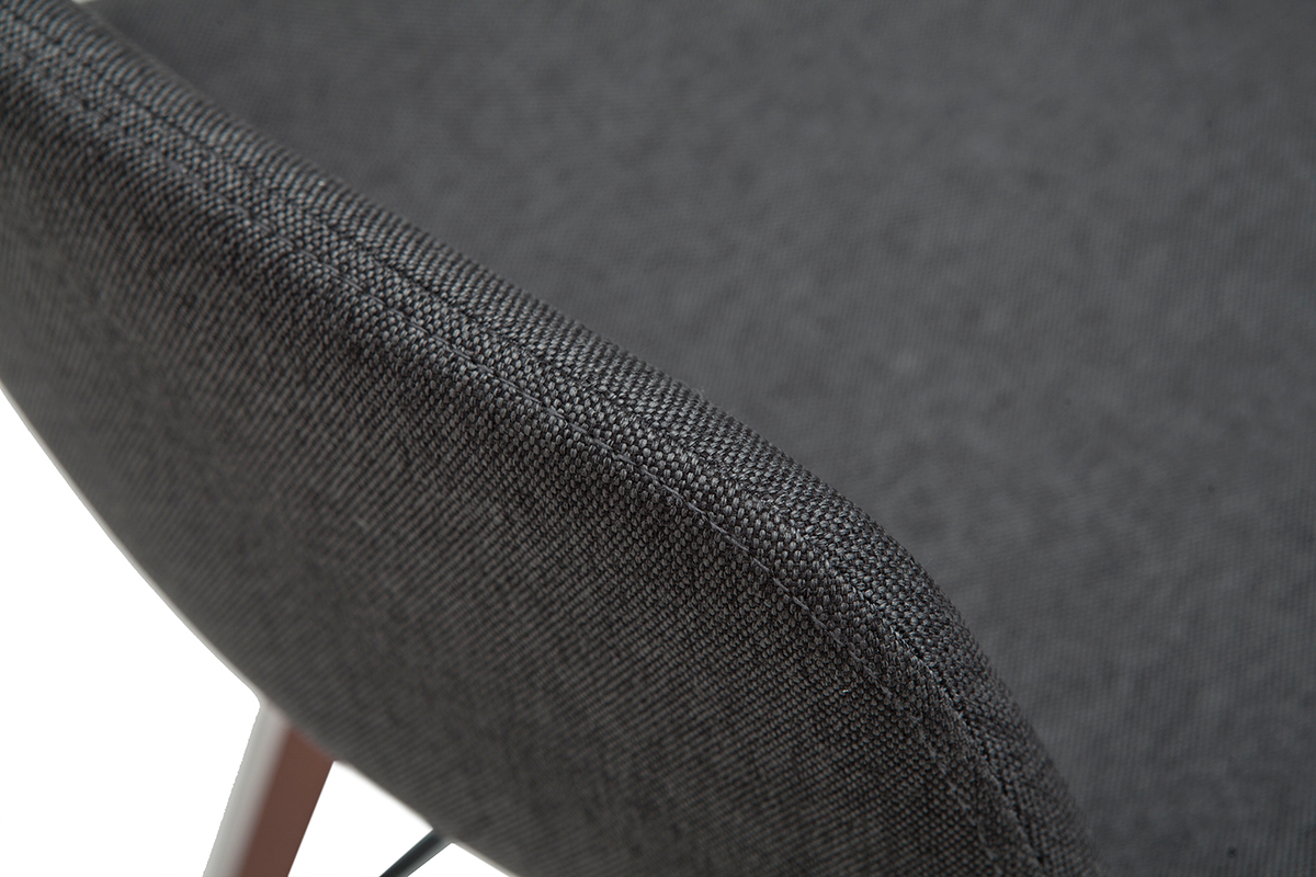 L'assise et le dossier haut de 24 centimètres sont rembourrés (densité de la mousse 24 kg/m3) et recouverts d'un joli revêtement en tissu gris foncé. Les jolis pieds inclinés en contreplaqué noyer et le repose-pieds de hauteur standard participent également au confort.