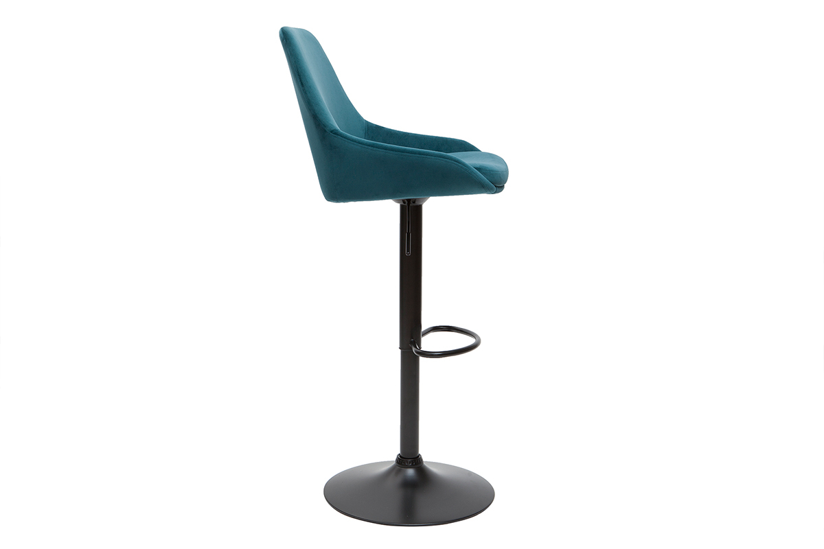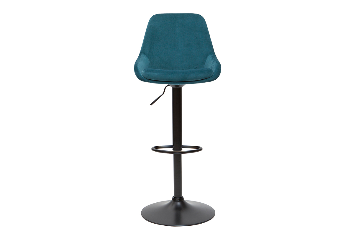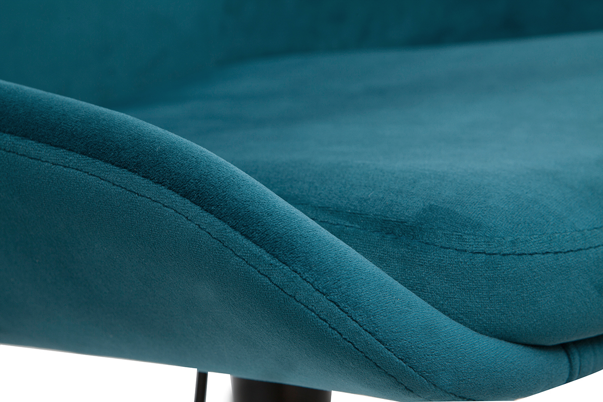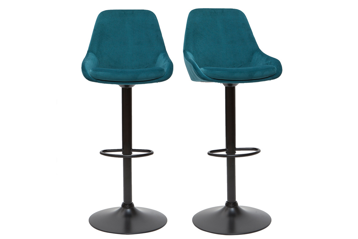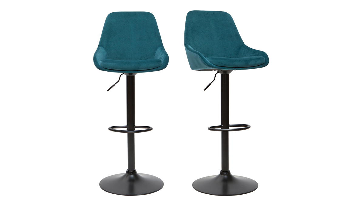En plus d'être parfaitement fonctionnels, les tabourets de bar HOLO offrent un vrai confort d'assise grâce à leur coque enveloppante. L'assise et le dossier sont rembourrés (densité mousse 24 kg/m3) et entièrement recouverts d'un magnifique tissu velours bleu pétrole (100% polyester) ultra doux au toucher. Le dossier haut (H38 cm) et le repose-pied intégré renforcent un peu plus l'idée de confort.