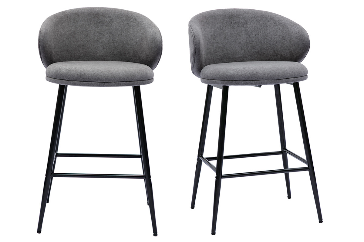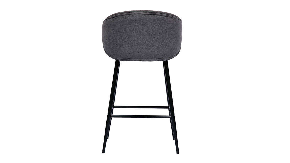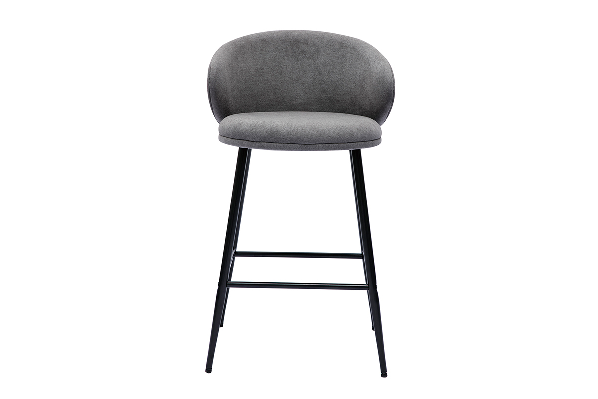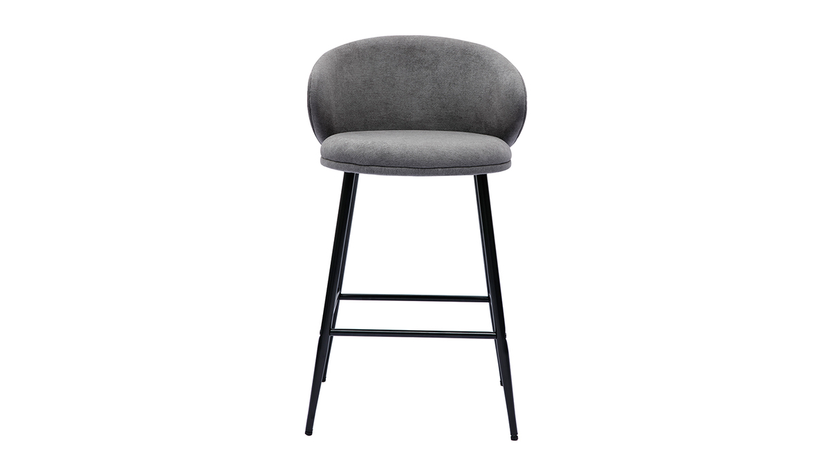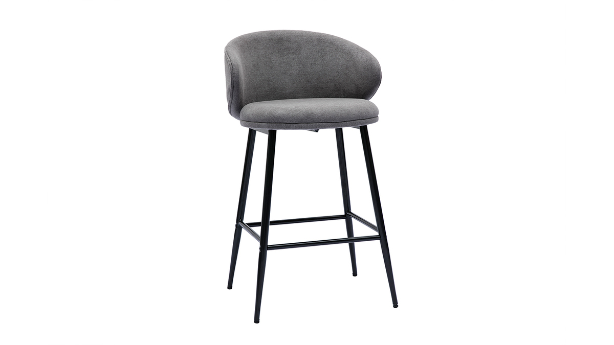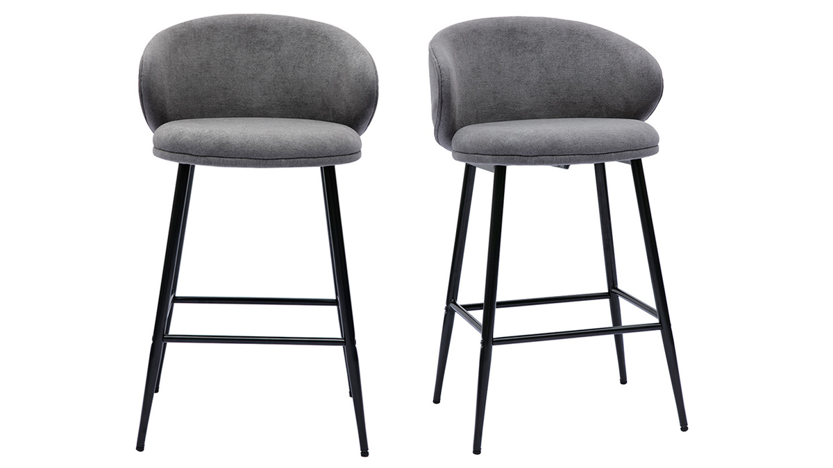 Les tabourets de bar ROSALIE sont recouverts d'un tissu effet velours gris (90% polyester, 10% nylon) doux au toucher. L'élégant passepoil qui dessine les contours du dossier parfait l'ensemble.