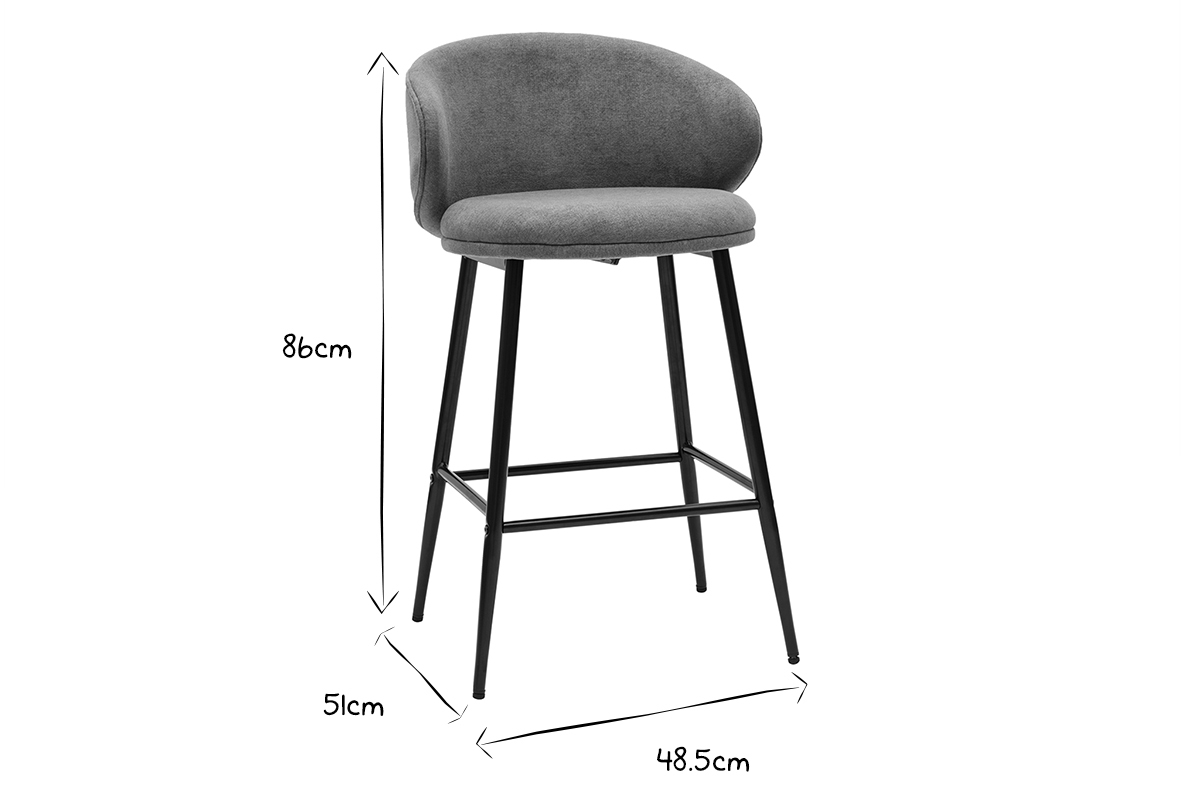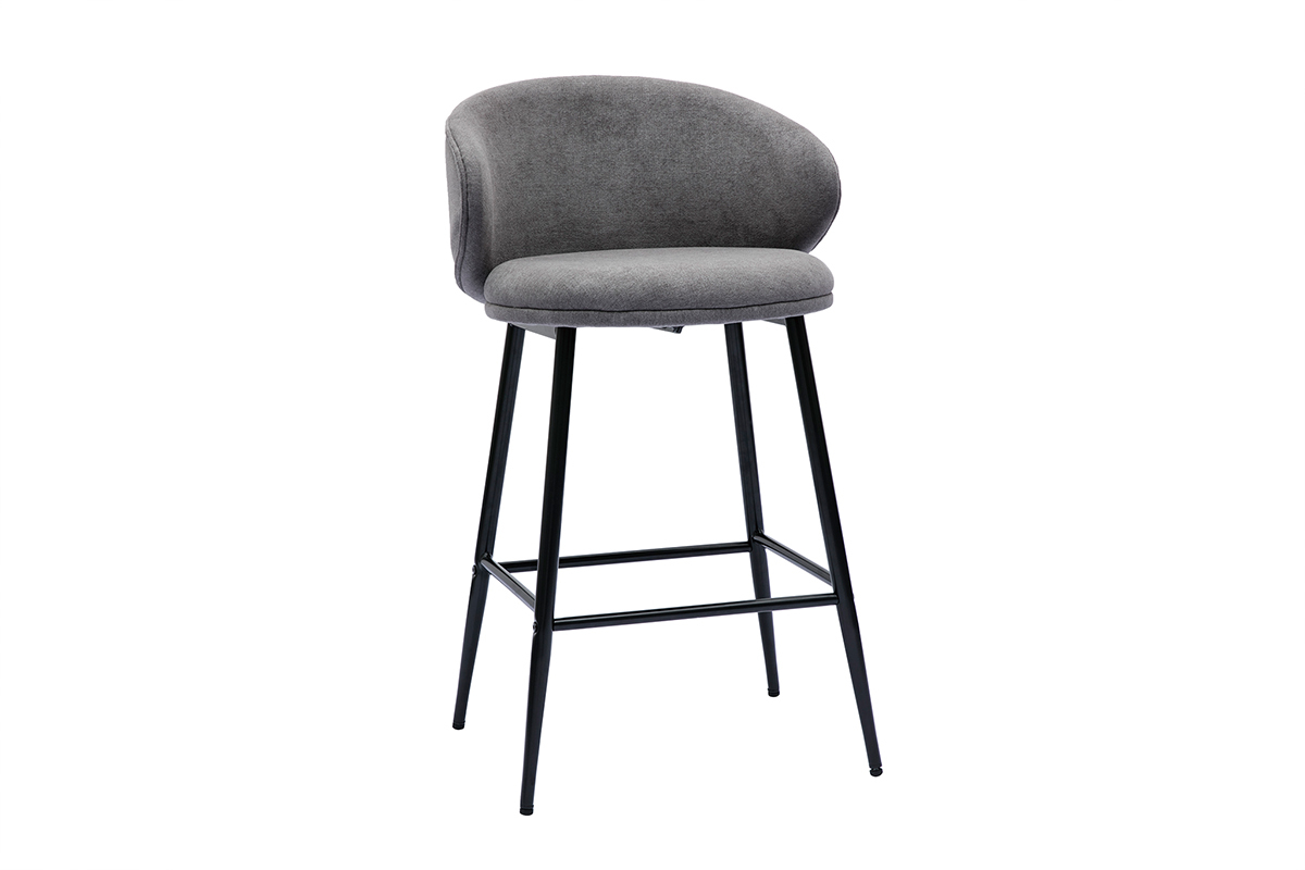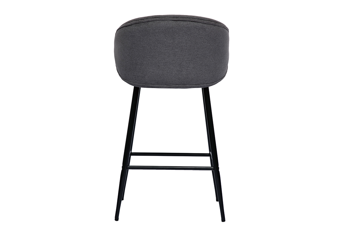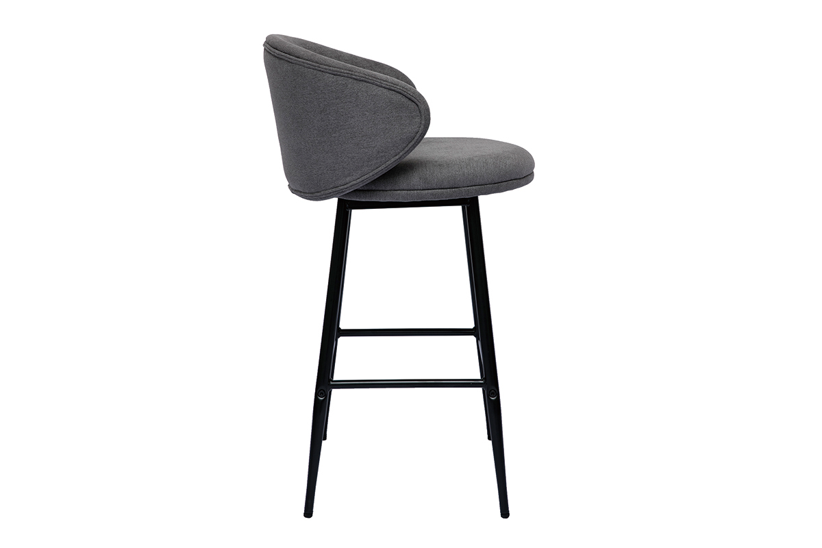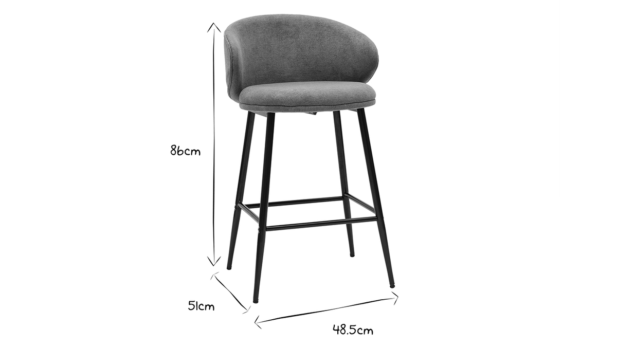 Les tabourets de bar ROSALIE sont recouverts d'un tissu effet velours gris (90% polyester, 10% nylon) doux au toucher. L'élégant passepoil qui dessine les contours du dossier parfait l'ensemble.