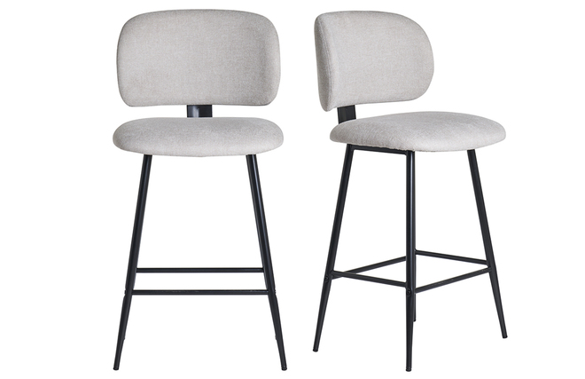 Tabourets de bar en tissu effet velours texturé beige et métal noir H70 cm vendus par lot de 2. Montage simple, seuls les pieds sont à fixer.