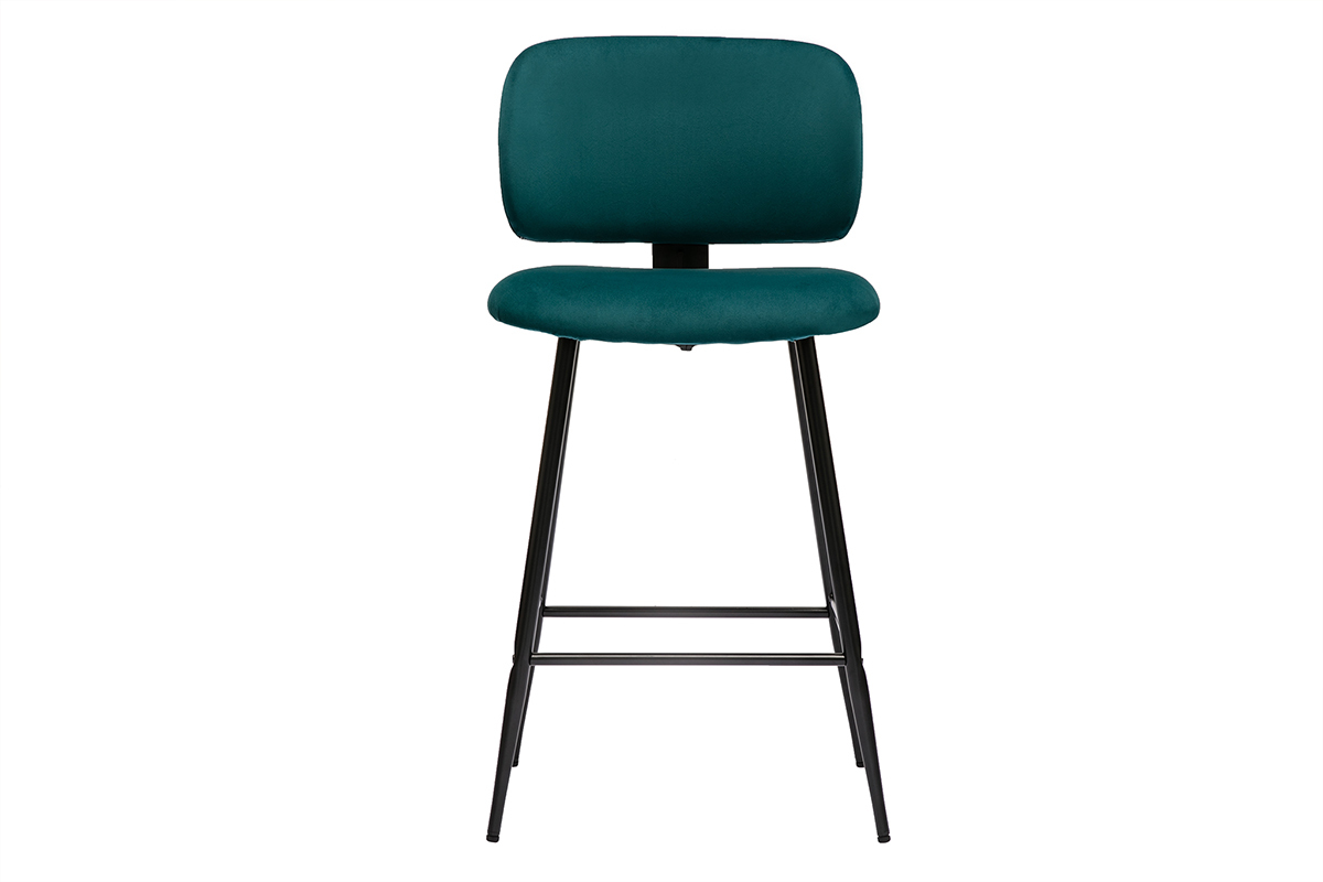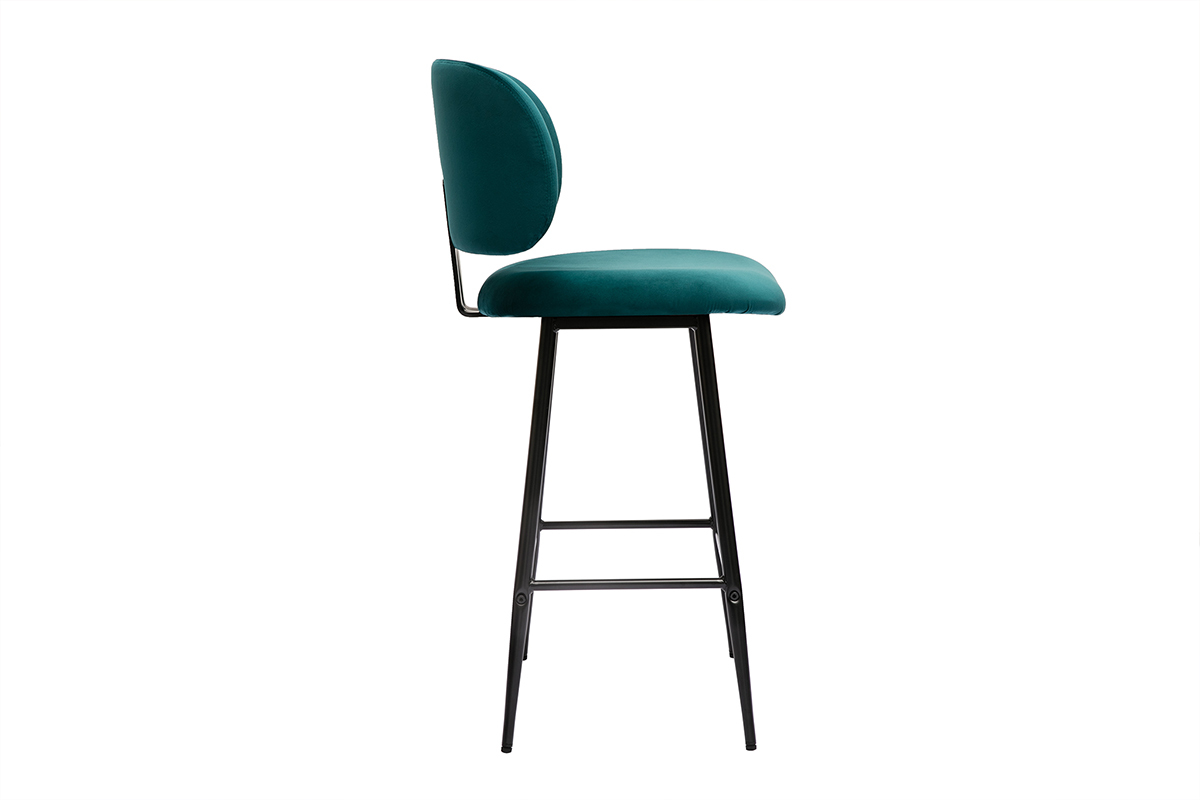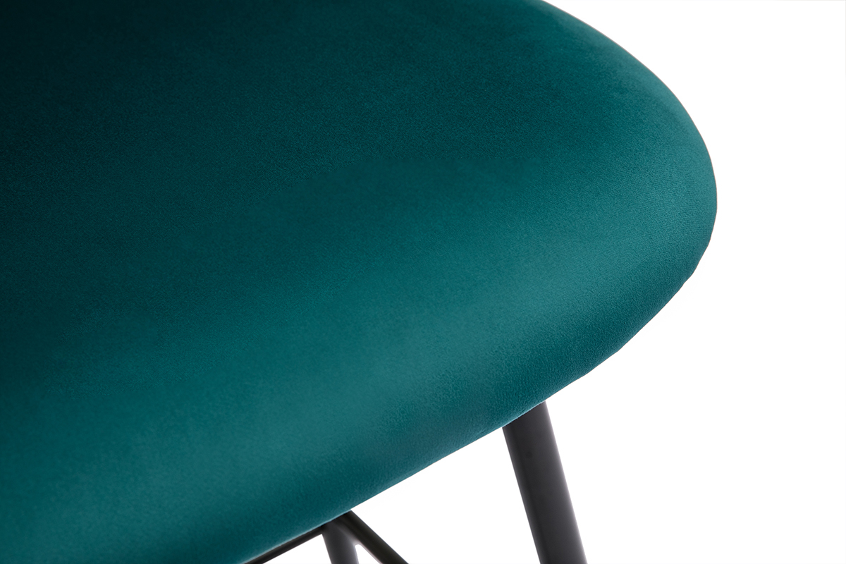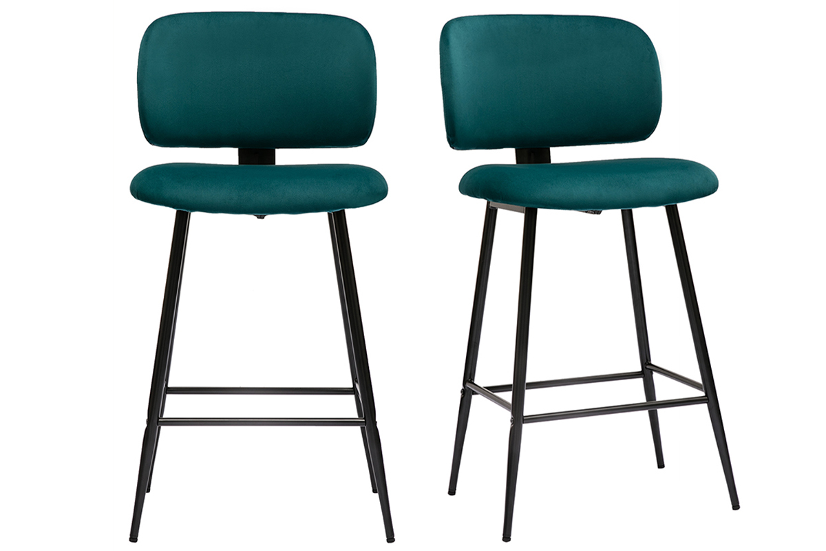 Tabourets de bar en tissu velours bleu pétrole et métal noir H70 cm vendus par lot de 2. Montage simple, seuls les pieds sont à fixer.