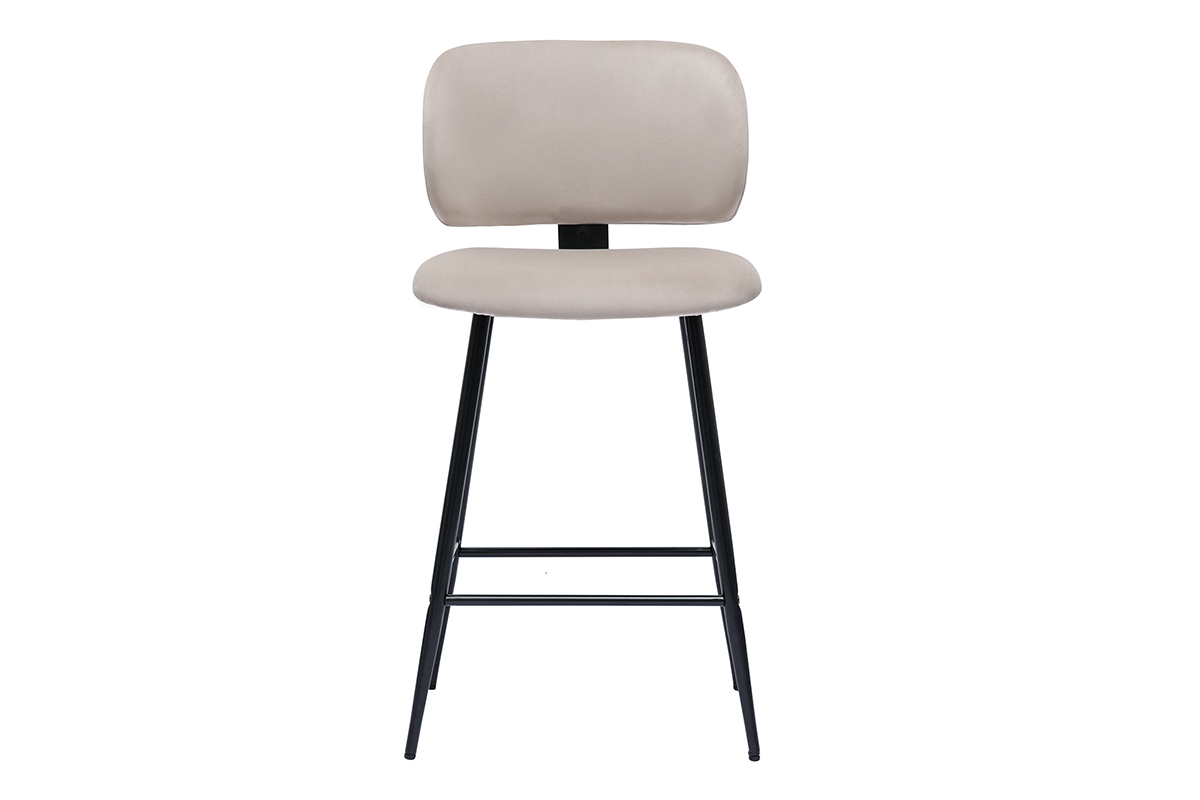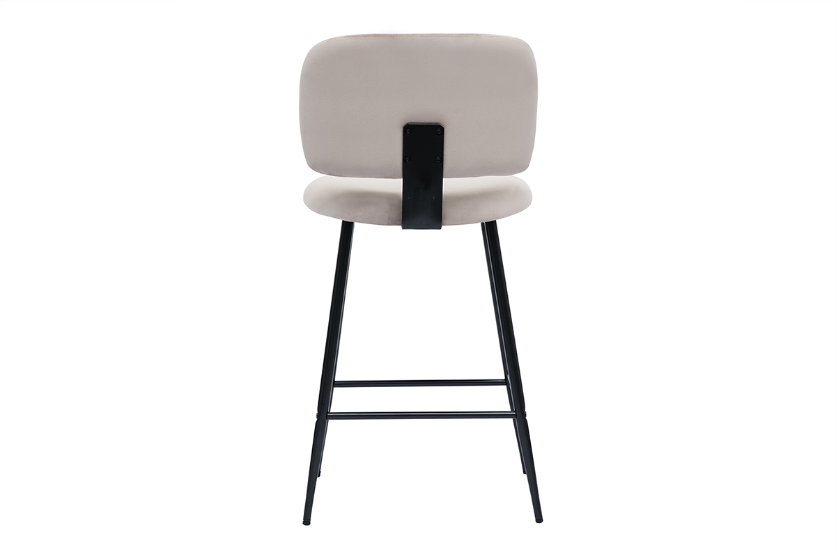 Tabourets de bar en tissu velours taupe et métal noir H70 cm vendus par lot de 2. Montage simple, seuls les pieds sont à fixer.