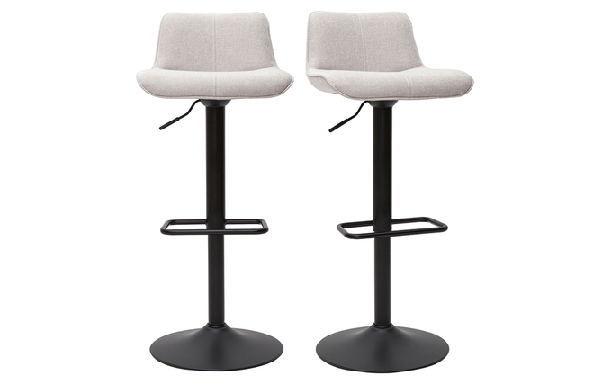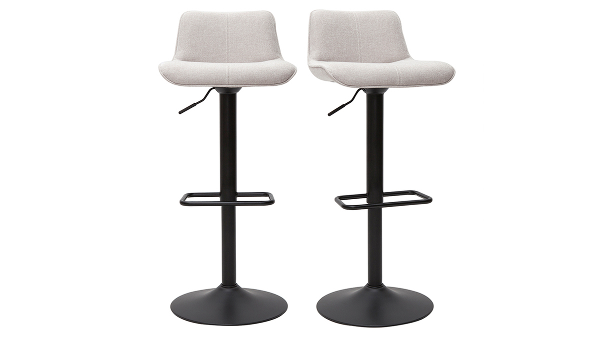 Tabourets de bar relevables en tissu velours texturé beige et métal noir vendus par lot de 2. Livrés prêts à monter.
