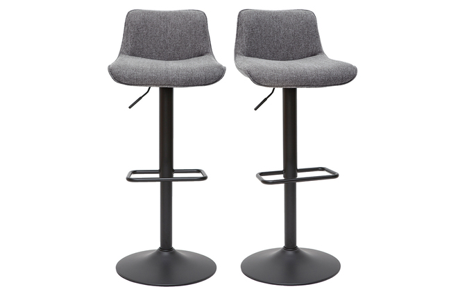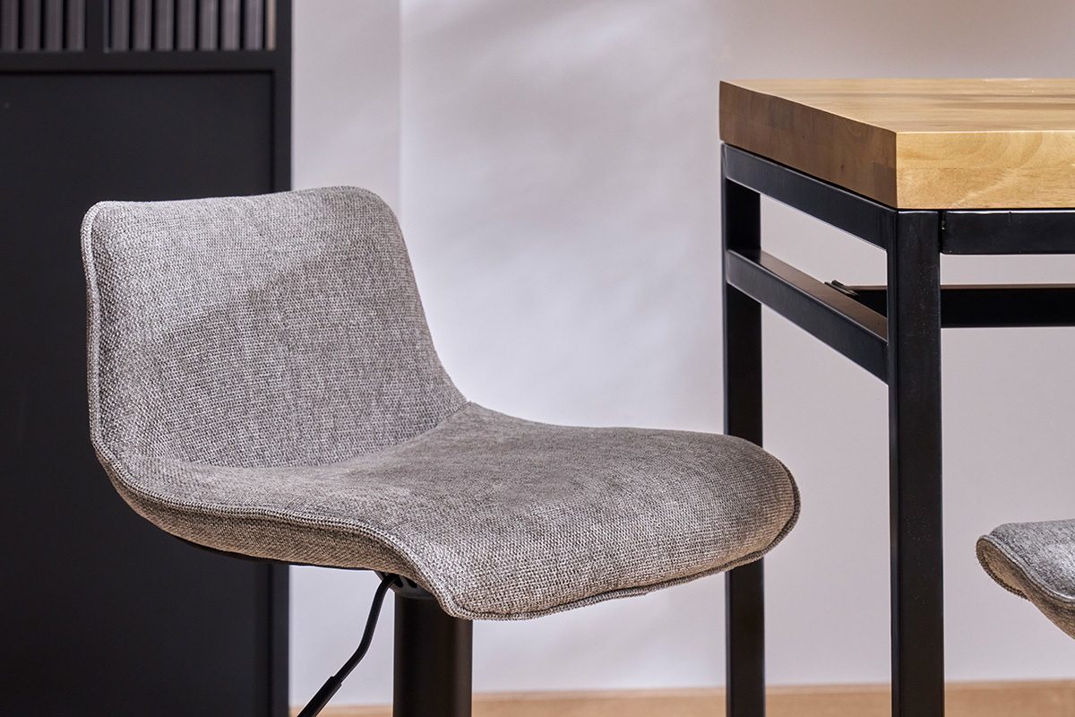 Tabourets de bar relevables en tissu velours texturé gris et métal noir vendus par lot de 2. Livrés prêts à monter.