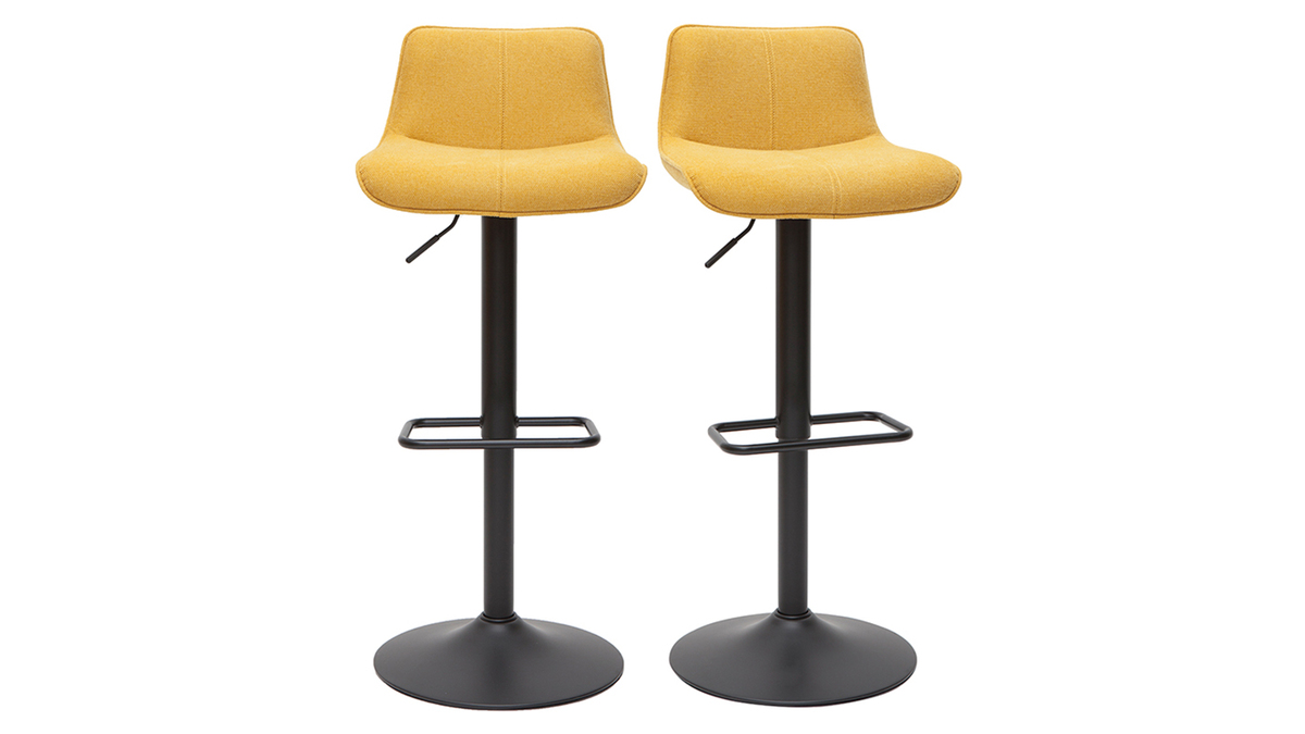 Tabourets de bar relevables en tissu velours texturé jaune moutarde et métal noir vendus par lot de 2. Livrés prêts à monter.