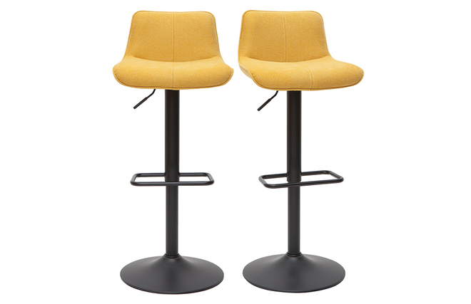 Tabourets de bar relevables en tissu velours texturé jaune moutarde et métal noir vendus par lot de 2. Livrés prêts à monter.