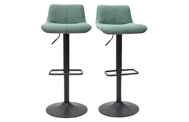 Tabourets de bar relevables en tissu velours texturé céladon et métal noir vendus par lot de 2. Livrés prêts à monter.