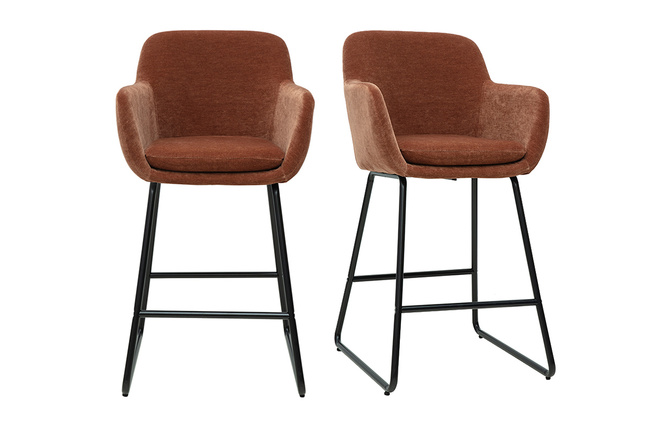 On aime particulièrement le contraste entre le piètement luge en métal noir très élancé et l'enveloppante assise rembourrée et moelleuse à souhait. L'assise et le dossier sont entièrement recouverts d'un joli tissu 100 % polyester terre brûlée à l'aspect et au toucher velours très doux.