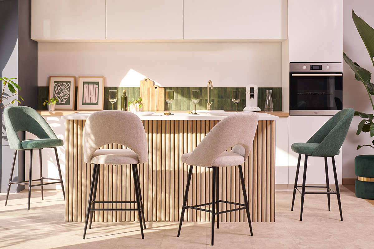 Avec les chaises de bar H65 cm COSETTE, recevez, dînez et télétravaillez dans le plus grand confort.