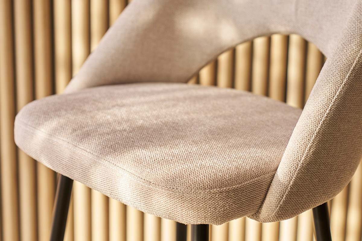 La douceur de leur revêtement, un superbe tissu effet velours texturé beige, ainsi que leur forme enveloppante laissent toute sa place au confort. Leur dossier haut et courbé (L37 x H38.5 cm) maintient bien la silhouette et leur coque généreusement rembourrée (densité de la mousse 25 kg/m3) garantit un accueil moelleux.
