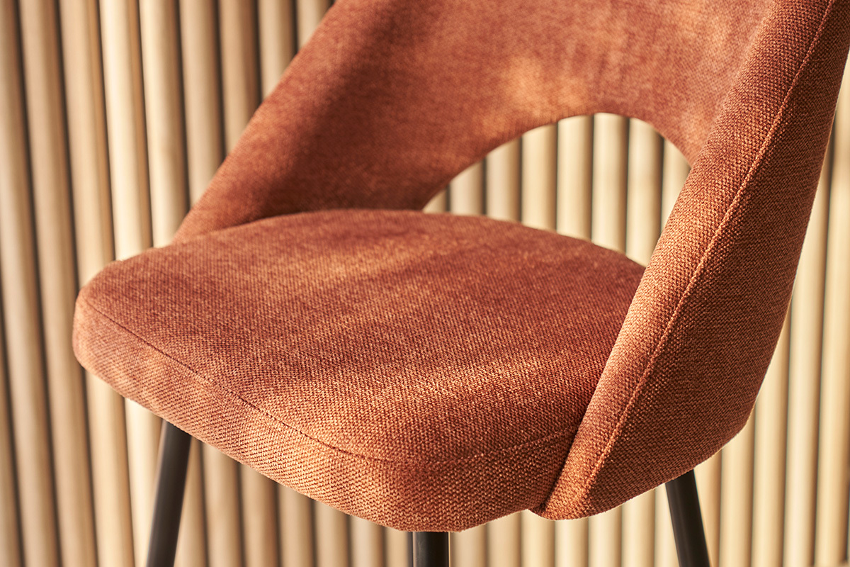 La douceur de leur revêtement, un superbe tissu effet velours texturé couleur terre brûlée, ainsi que leur forme enveloppante laissent toute sa place au confort. Leur dossier haut et courbé (L37 x H38.5 cm) maintient bien la silhouette et leur coque généreusement rembourrée (densité de la mousse 25 kg/m3) garantit un accueil moelleux.