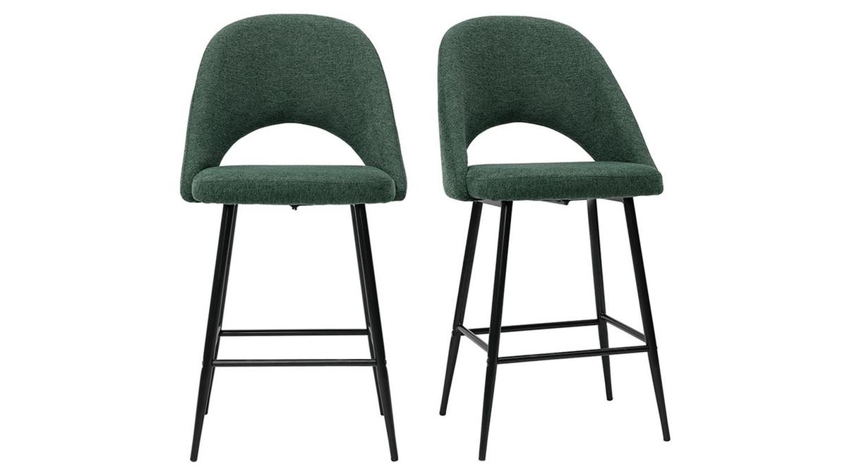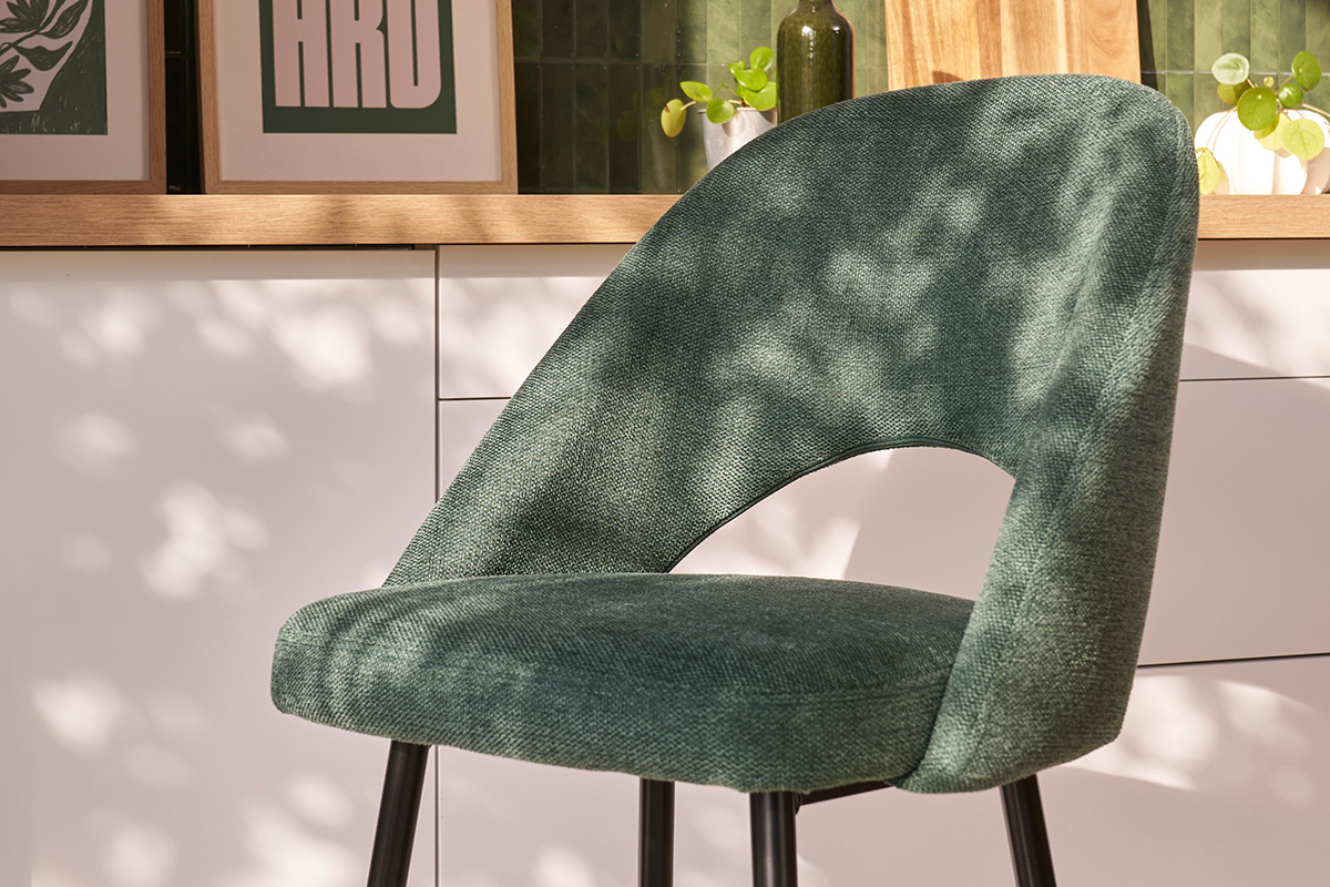 La douceur de leur revêtement, un superbe tissu effet velours texturé vert, ainsi que leur forme enveloppante laissent toute sa place au confort. Leur dossier haut et courbé (L37 x H38.5 cm) maintient bien la silhouette et leur coque généreusement rembourrée (densité de la mousse 25 kg/m3) garantit un accueil moelleux.