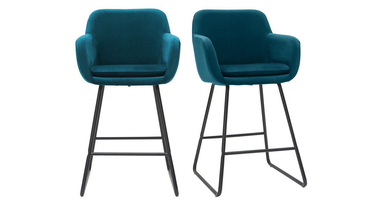 Chaises de bar en velours bleu pétrole vendues par lot de 2 et livrées prêtes à assembler.