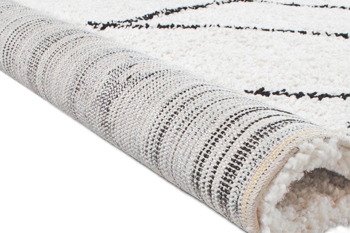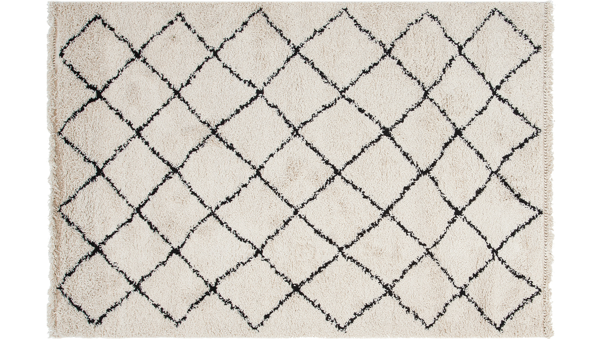 Ce tapis écru à losanges noirs se distingue par le détail de sa finition frangée, un clin d'oeil au tant apprécié tapis oriental.