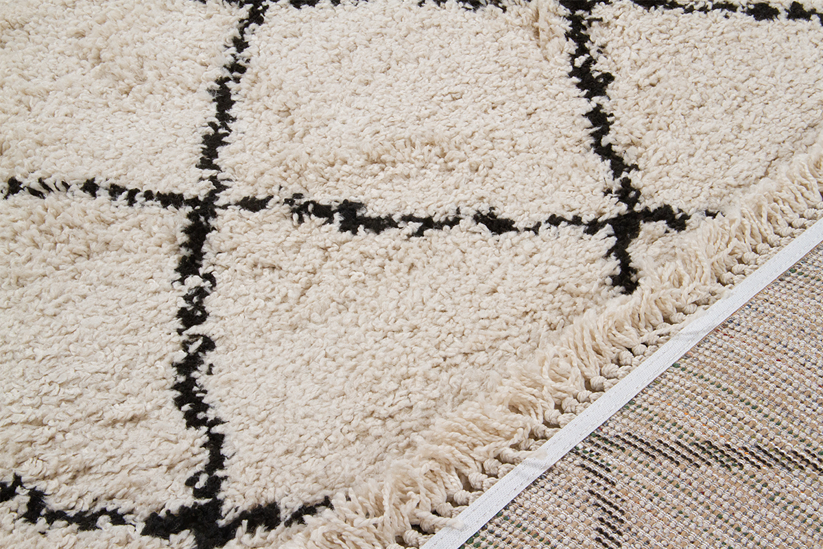 Ses losanges noirs superposés sur fond écru et sa finition frangée font écho aux tapis berbères d'inspiration orientale. Texturé et au style brut, le tapis ZELIA se fondra dans une pièce à l'ambiance ethnique ou bohème chic.