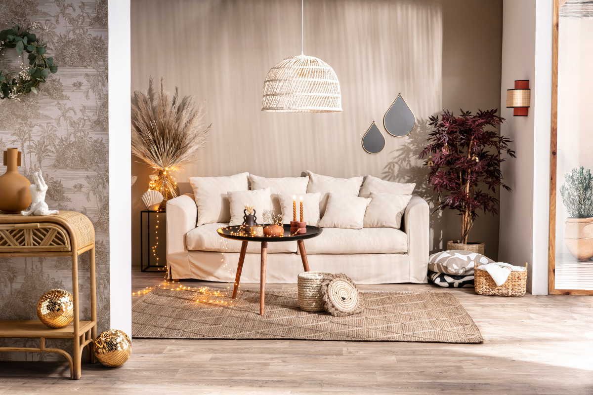 En plus d'être un élément de décoration à part entière, ce grand tapis en jute (L230 x L160 cm) est idéal pour réchauffer l'atmosphère et structurer les espaces dans une pièce de vie ouverte. On l'associe volontiers à un canapé au revêtement tissu lin pour parfaire le look bohème chic de son séjour. On l'imagine aussi très bien en descente de lit dans une chambre empreinte de poésie...