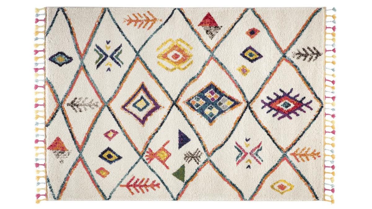 Ce tapis empreint d'un style berbère très tendance offre un contraste saisissant entre une toile de fond blanc crème et des motifs aux couleurs chatoyantes. Composée à 100% de polypropylène tissé, sa trame présente une grande résistance et une incroyable douceur.