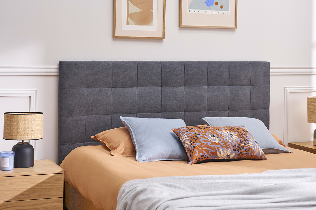 Avec la tête de lit en tissu HALCIONA très grand format, habillez les murs d'une chambre d'adulte en un clin d'oeil. Ses dimensions généreuses (L180 x P5 x H120 cm) ont été étudiées pour compléter un lit 180 cm king size. Son design moderne donne à la chambre à coucher un style élégant et actuel. Recouverte d'un joli tissu gris anthracite, cette tête de lit 180 cm offre un rendu épuré qui se marie à de nombreuses tendances.