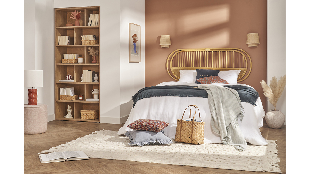 Pour sublimer votre espace nuit, placez un tapis douillet et duveteux aux tons clairs aux côtés de votre lit et pensez à sublimer votre éclairage avec une suspension ou des appliques murales en rabane pour un style poétique.