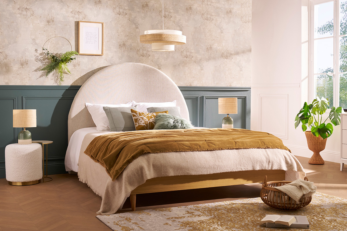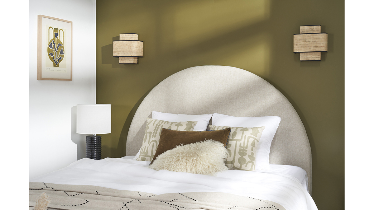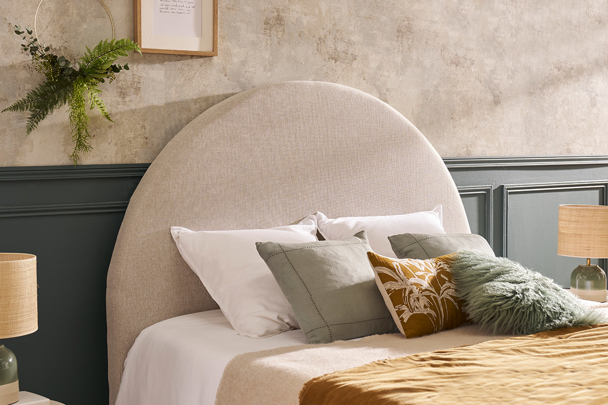 Parce que la chambre se doit d'être la pièce la plus cocooning de la maison, adoptez sans hésiter cette tête de lit en forme de demi-lune !